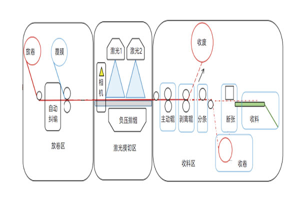 激光器功率调节:如图1所示,数字激光模切机由收放料机构和激光模切系统组成,收放料机构与传统模切机类似 绿巨人网站入口,只需调节好收放料张力,而激光模切系统需重点调节激光器功率,模切不同材料,不同穿透程度(全穿或半穿),不同模切速度时,所需调节的功率都不同,一般来说,模切速度越快,功率调节越大,模切速度越慢,功率调节越小。